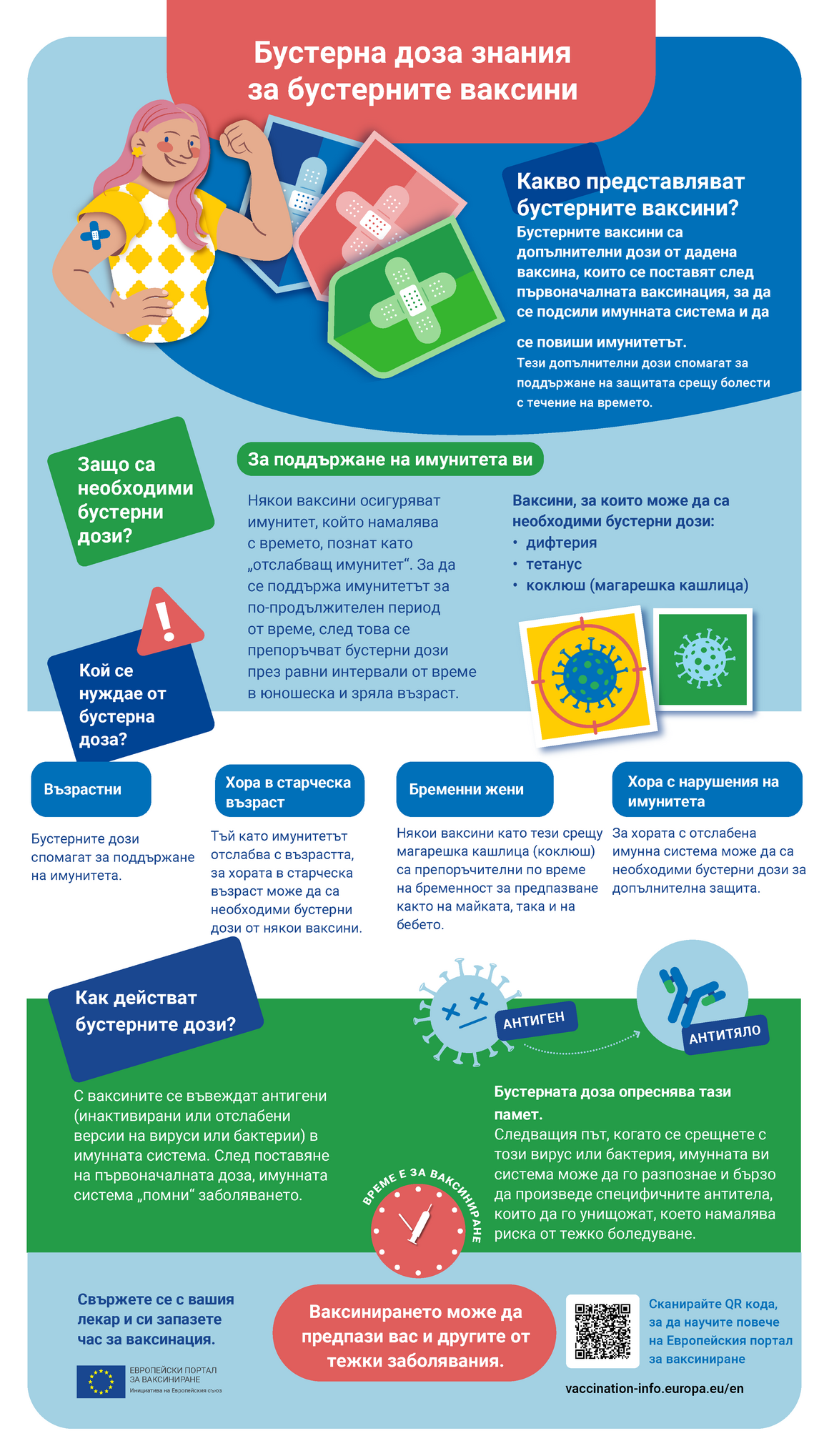 Инфографиката обяснява какво представляват бустерните дози, защо са необходими и как действат.