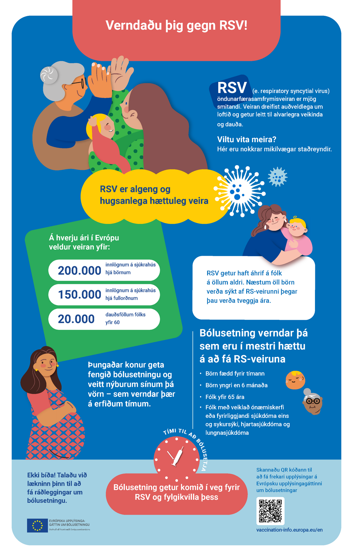 Þessi upplýsingamynd útskýrir hvað RS-veira (öndunarfærasamfrymisveira) er og hvernig þú getur varið þig gegn henni.